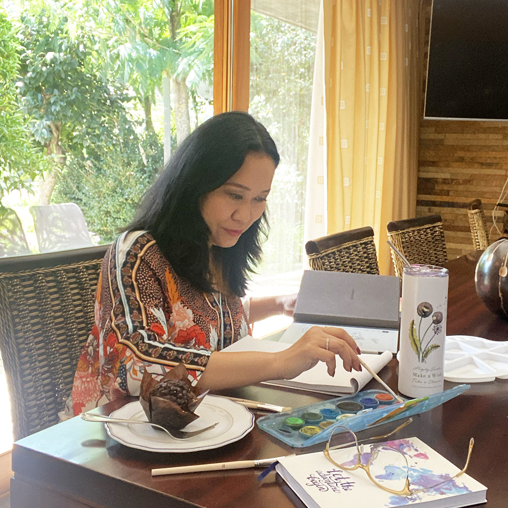 Born in Indonesia, Erna was a self-taught artist who grew up in a middle-class entrepreneurial family in Indonesia. After graduating high school, she came to the USA to study graphics and packaging design at Art Center College of Design, Pasadena. The year she graduated in 2000, she also started her family and began her 15 years of creative career as a Graphic Designer, working for a private label home and fine fragrance company that developed products for Fortune 500 clients. She worked her way up to a Creative Director position, managing 7-figure accounts, but the reality was her health and family life were suffering.
